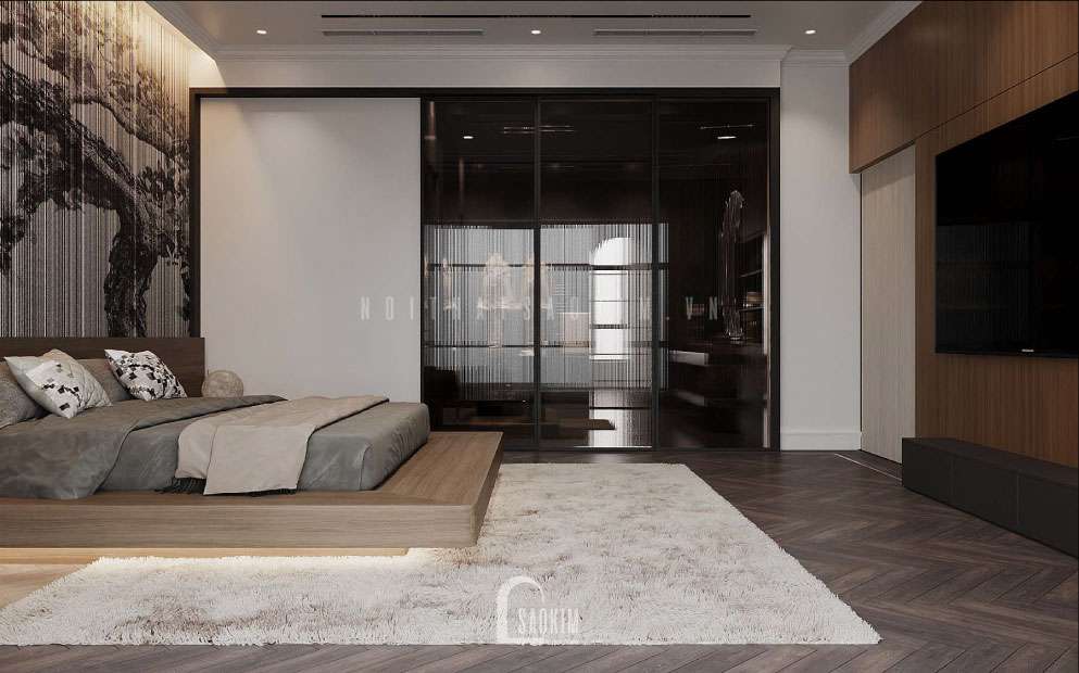 Thiết kế tivi treo tường trong phòng ngủ tiện lợi, gia chủ có thể xem phim, nghe nhạc ngay tại phòng riêng của mình mà không ảnh hưởng đến các phòng khác.
