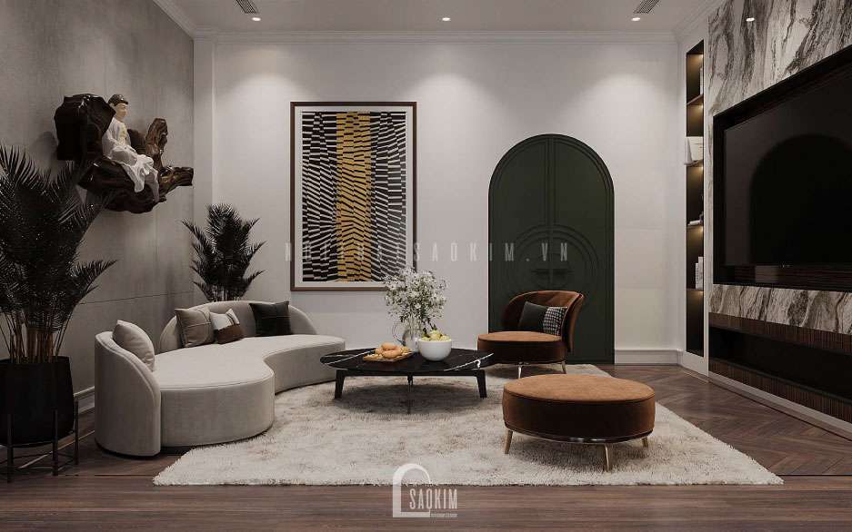 Thiết kế nội thất phòng khách nhà liền kề Louis City Hoàng Mai đẹp theo phong cách hiện đại