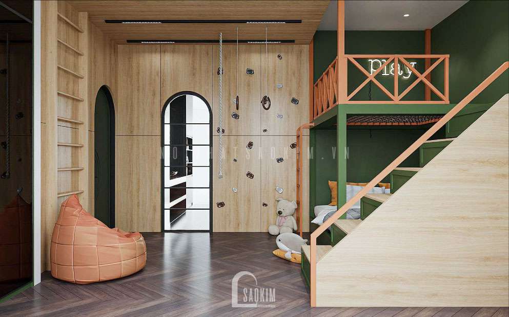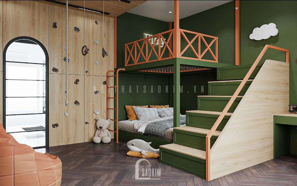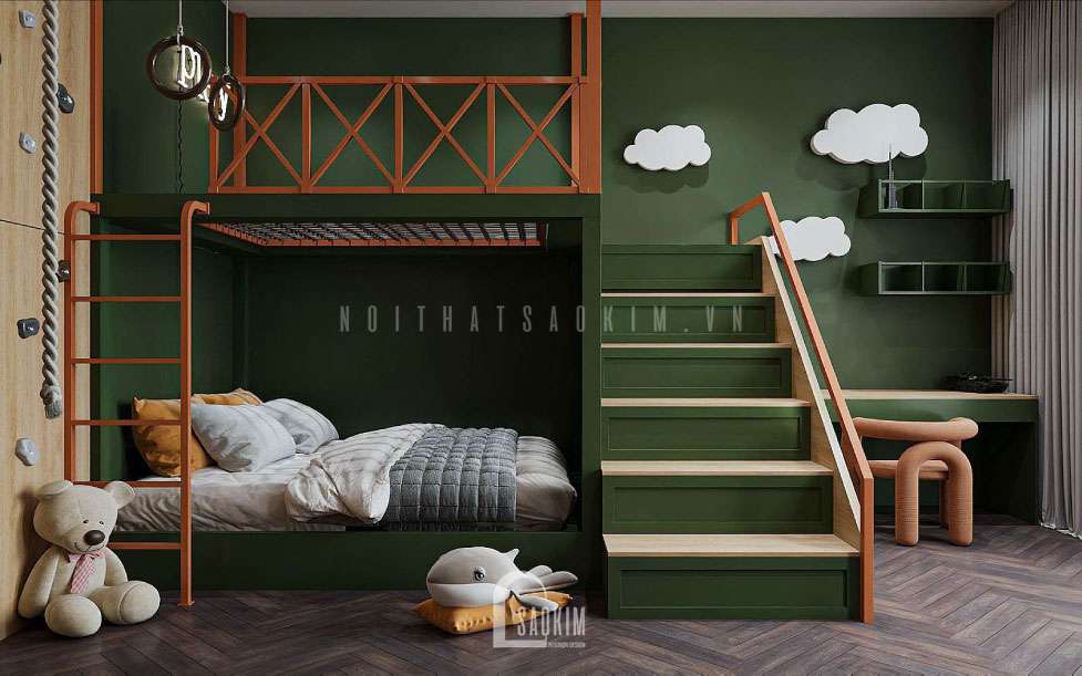 Giường ngủ tầng giúp tối ưu hóa không gian phòng ngủ cho bé mang đến một không gian rộng rãi giúp bé hoạt động thể thao trong phòng thoải mái hơn.