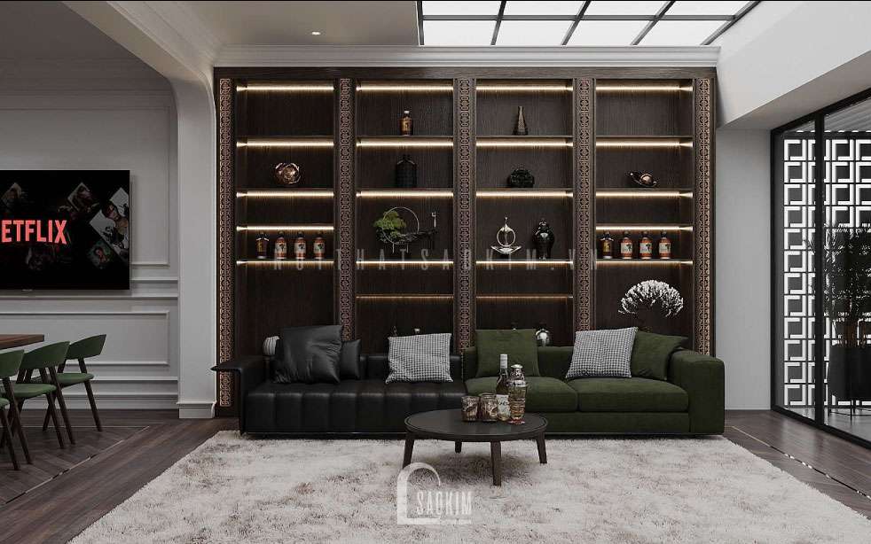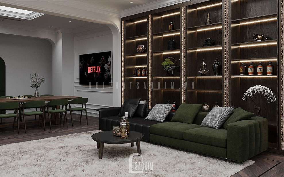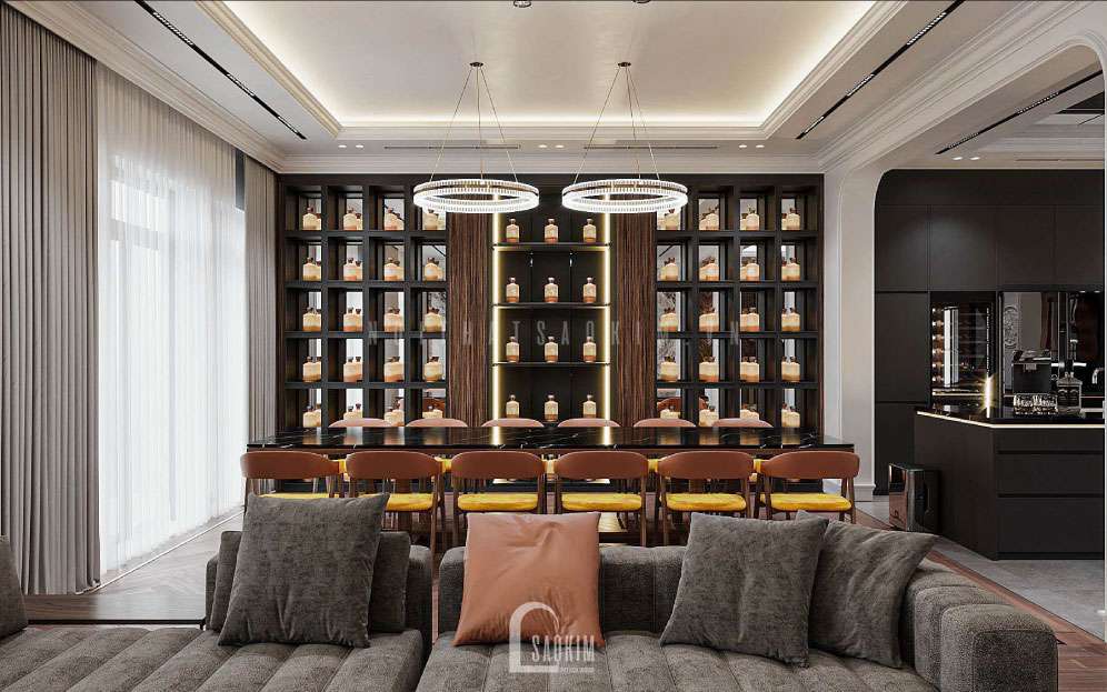 Tủ, kệ rượu quý phía sau ghế sofa để trưng bày, có thể tiếp đãi khách quý.