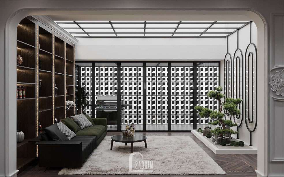 Khu vực để gia chủ trưng bày dáng cây bonsai mang thiên nhiên vào không gian sống. Giếng trời được bố trí trên trần tầng 5 để cung cấp ánh sáng cho cây phát triển.
