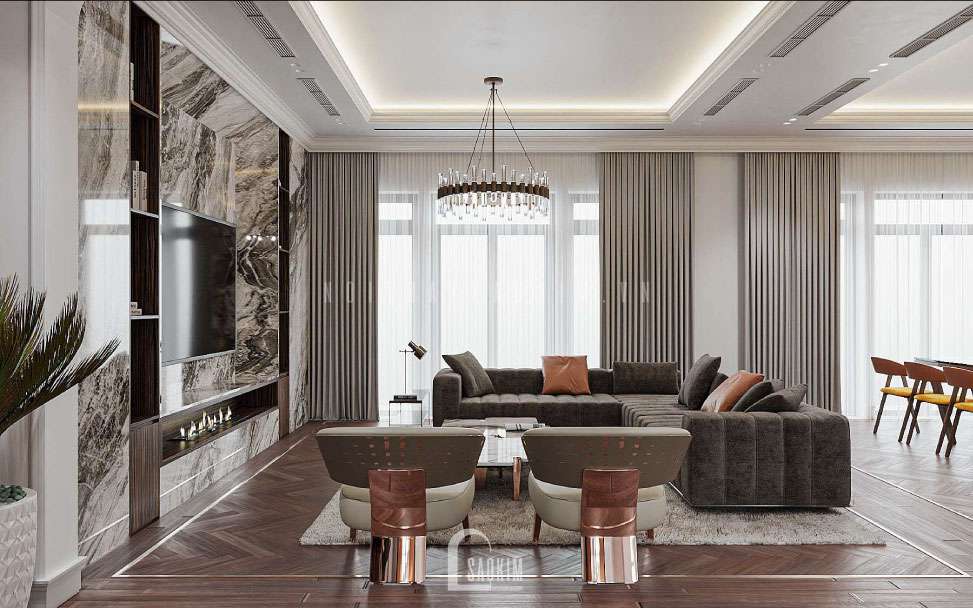 Ánh sáng tự nhiên và bố trí hệ thống đèn hợp lí cho phòng khách thoáng đãng, sang trọng cung cấp đủ ánh sáng cho căn phòng giúp cho không gian căn phòng không quá tối sẽ gây cảm giác ngột ngạt, khó chịu cho những giây phút thư giãn của gia đình cũng như khách đến chơi nhà.