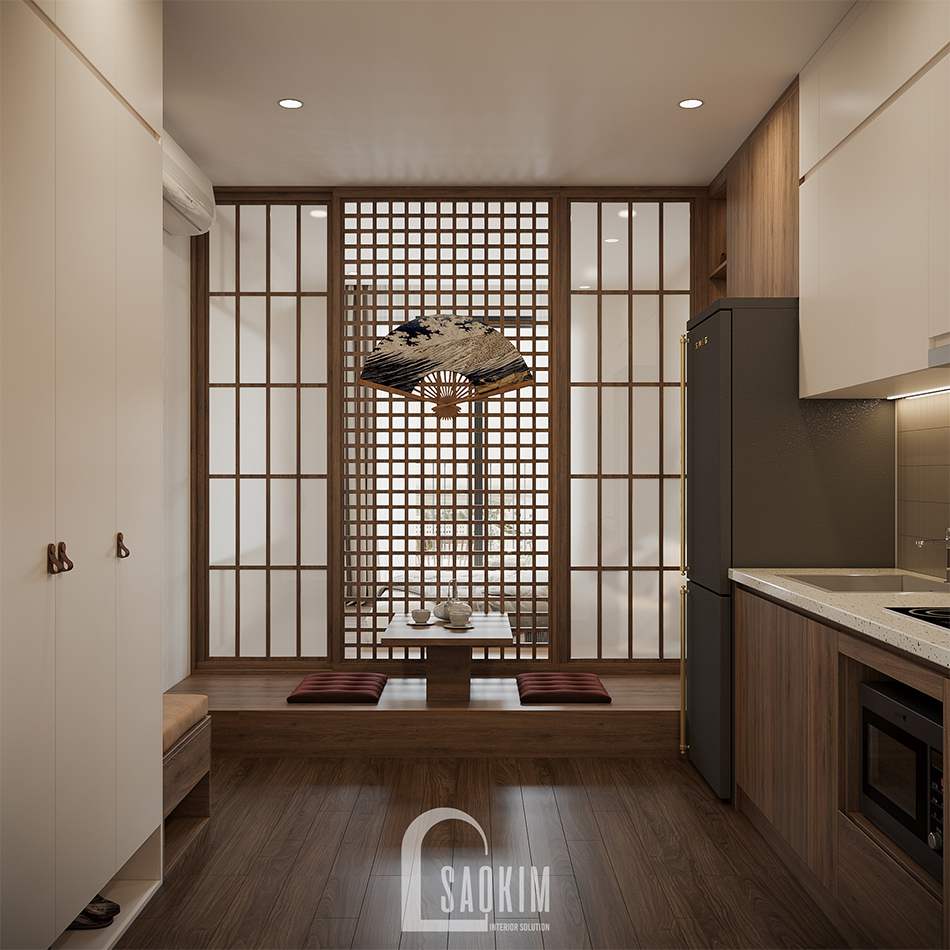 Thay vì sử dụng ghế sofa không gian này thiết kế phản với bàn thấp và nệm ngồi đậm chất Nhật.Thiết kế nội thất Nhật Bản trong căn hộ này chủ yếu sử dụng các đường thẳng, những chi tiết rườm rà được hạn chế 1 cách tối đa. Màu sắc, đồ nội thất sử dụng khá đơn giản nhằm tiết kiệm đối đa không gian nhưng vẫn toát lên vẻ đẹp sang trọng, tinh tế.