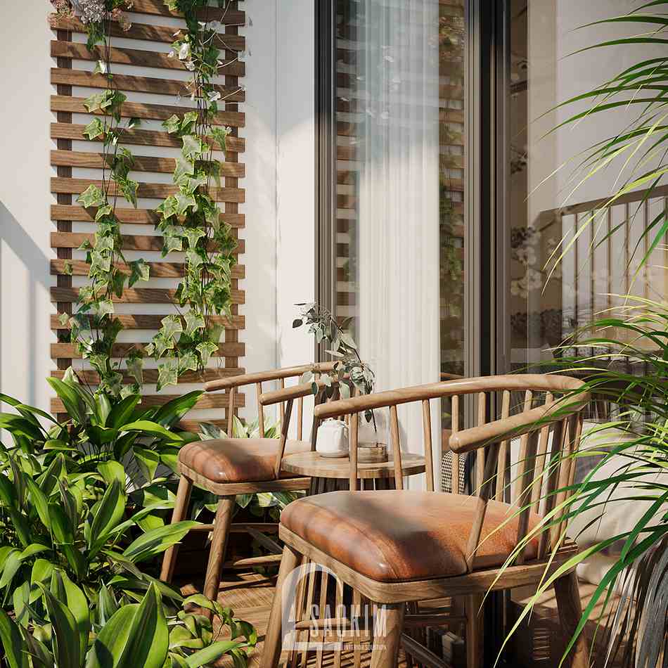 Ban công xanh mát là nơi thư giãn cho gia chủ mỗi ngày. Bộ bàn ghế nhỏ êm ái đặt tại đây để gia chủ ngồi thưởng trà, đọc sách,…