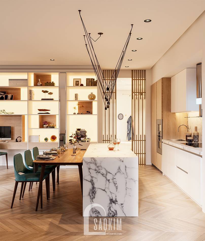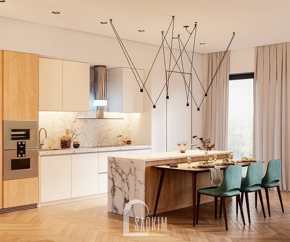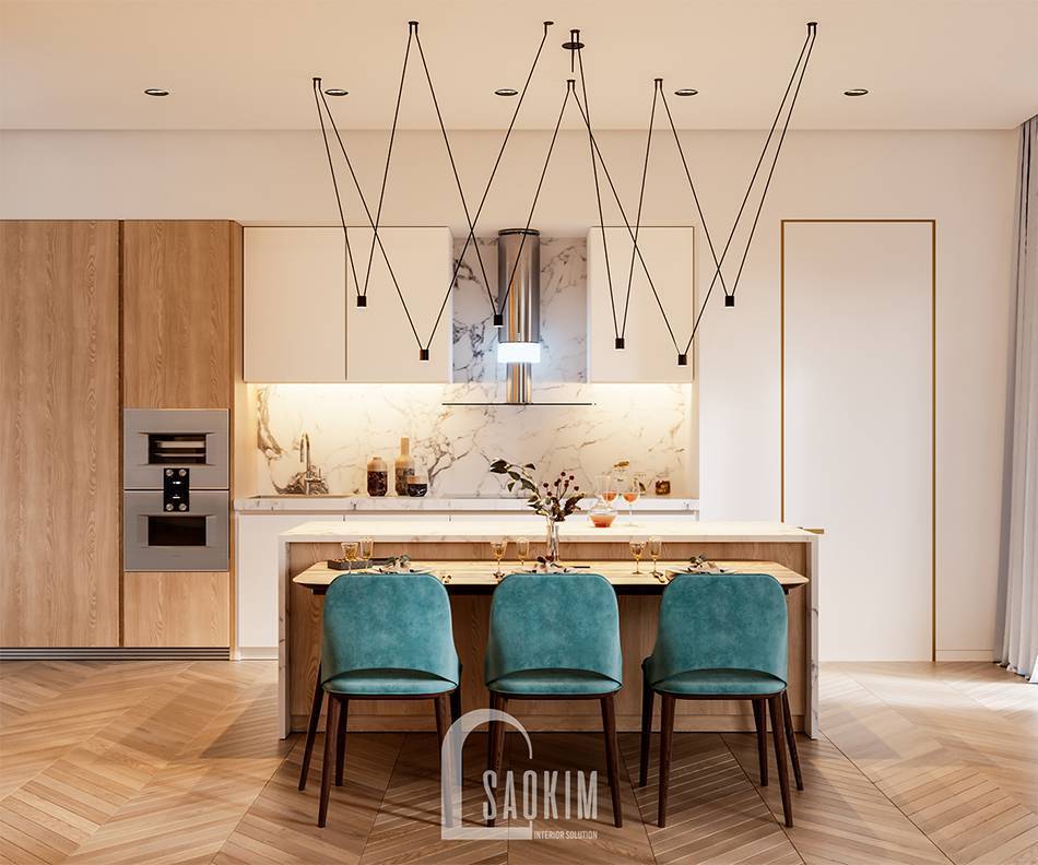 Phòng bếp là trái tim của ngôi nhà. Ngày nay, nhà bếp không chỉ là nơi nấu ăn mà còn là không gian sinh hoạt của cả gia đình trong những bữa cơm Một phòng bếp tiện nghi mà ấm cúng chính là ngọn lửa vô hình sưởi ấm tình cảm của các thành viên trong gia đình. Thiết kế nội thất phòng bếp chung cư Vinhomes West Point là một minh chứng điển hình cho không gian bếp hoàn hảo này. Hãy cùng Sao Kim chiêm ngưỡng vẻ đẹp của không gian bếp này nhé!