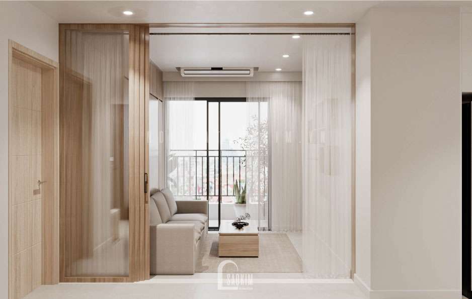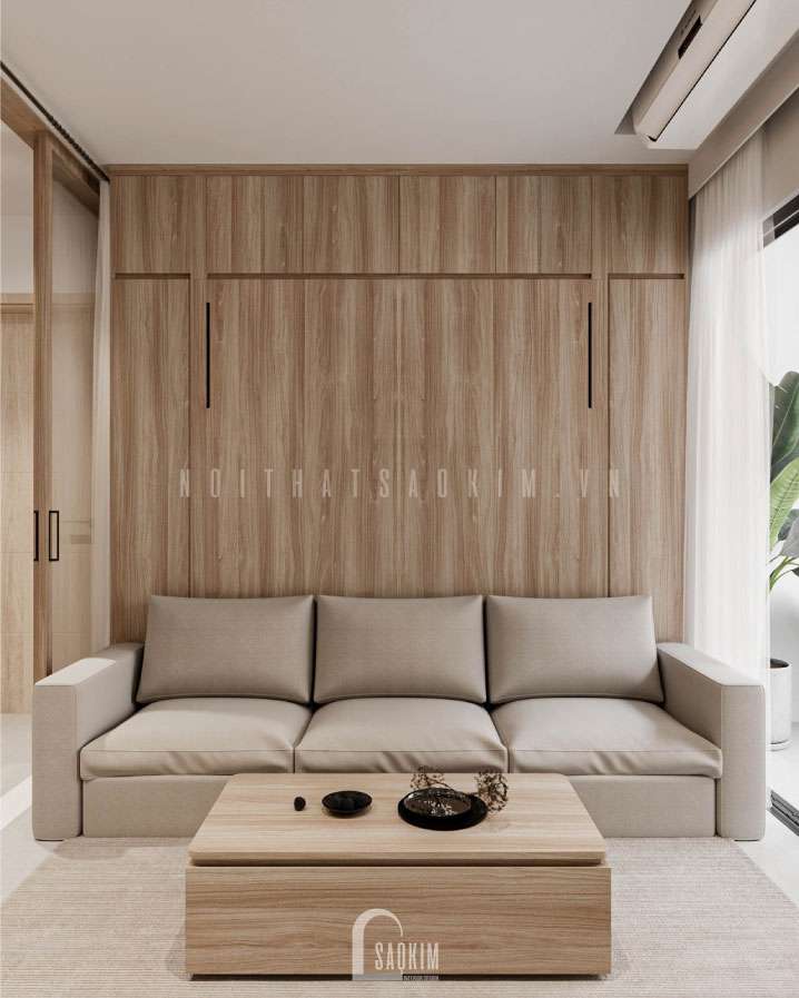 Trong thiết kế phong cách Japandi màu sắc chủ đạo thường là những gam màu trắng, xám và nâu gỗ. Không gian tiếp khách đặt ngay cạnh cửa sổ đón ánh sáng tự nhiên từ ngoài vào. Ngoài ra, ở cửa sổ còn được bố trí nhiều cây xanh để không khí được lưu thông, trong lành hơn tránh cảm giác bị ngột ngạt.