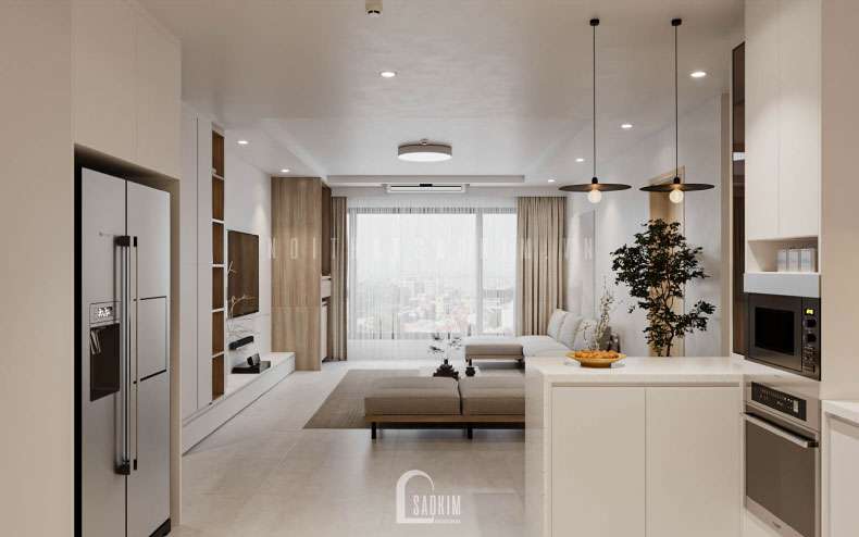 Thiết kế nội thất không gian sinh hoạt chung phòng khách, phòng bếp, phòng ăn không quá tập trung vào việc trang trí mà đề cao sự tiện lợi và phát huy công năng sử dụng hơn. Ánh sáng tự nhiên ngoài ban công sẽ chiếu vào phòng tạo cảm giác thông thoáng.