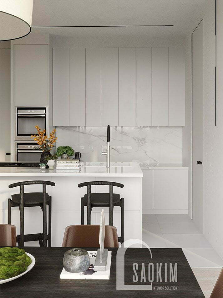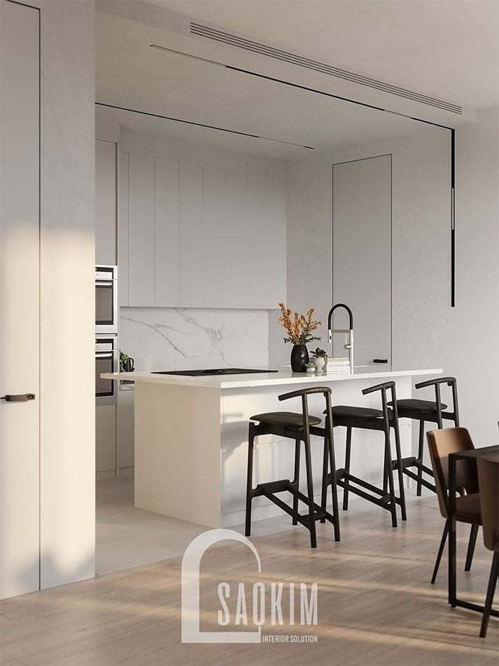 Thiết kế phòng bếp biệt thự biển cao cấp dưới đây không chỉ đảm bảo về mặt công năng mà còn đảm bảo cả những yếu tố thẩm mỹ. Không gian bếp tươi mới, thoáng đãng được bao phủ bởi gam màu trắng. Phòng bếp biệt thự chú ý đến ánh sáng và những chi tiết trang trí mang đến vẻ đẹp độc đáo, cuốn hút cho nơi đây.