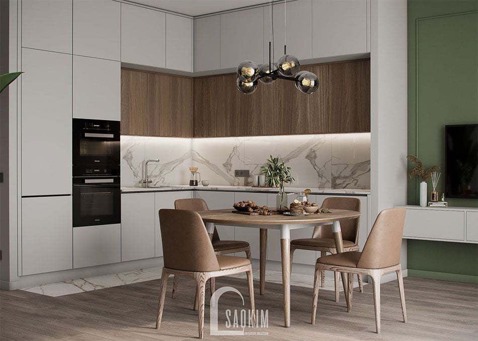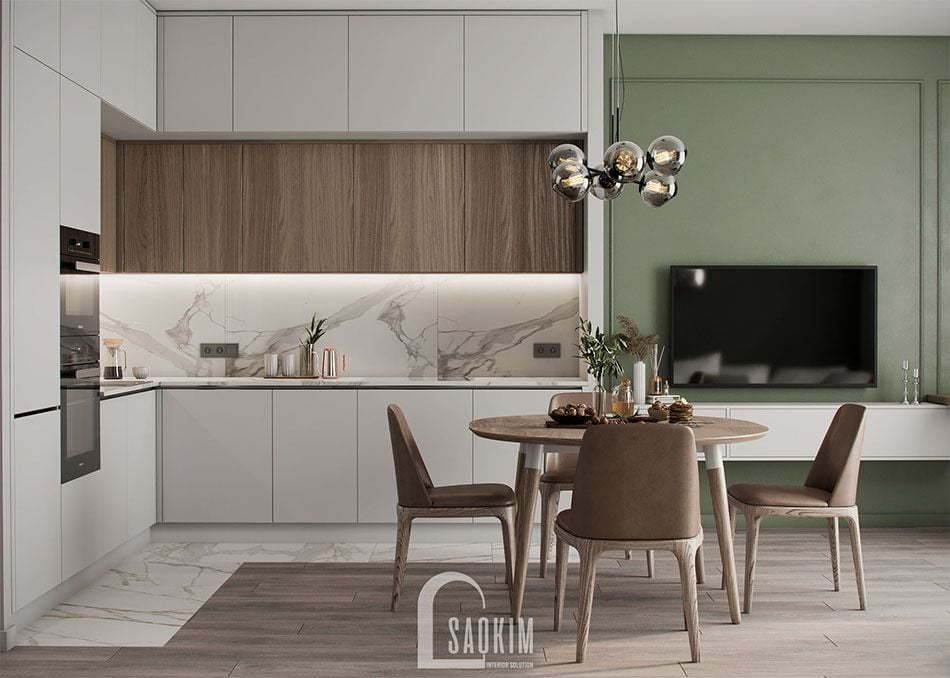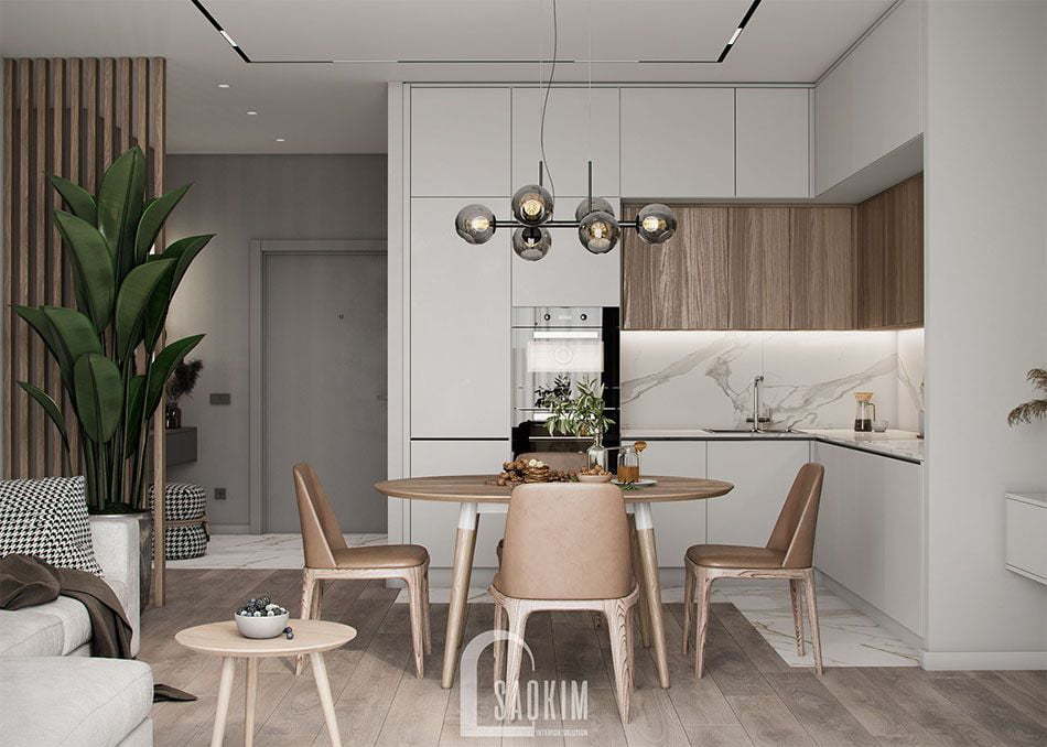 Mẫu thiết kế phòng khách và bếp căn hộ 85m2 Golden Palace Mễ Trì toát lên vẻ sang trọng, thanh lịch. Phòng ăn và bếp được bố trí liên thông với phòng khách mang đến không gian sinh hoạt chung tiện lợi cho những thành viên trong gia đình. Hãy cùng nội thất Sao Kim chiêm ngưỡng vẻ đẹp của không gian này nhé!