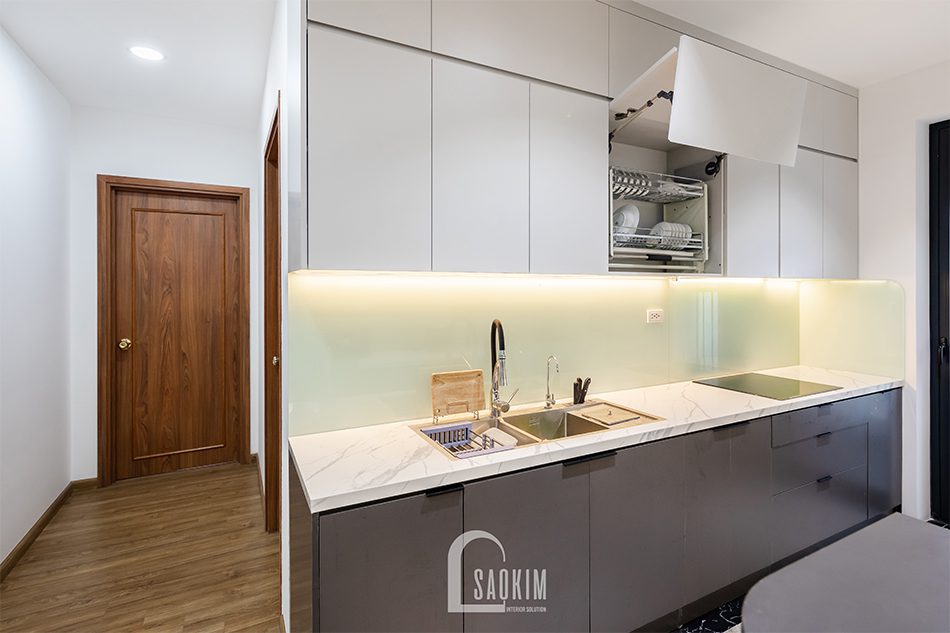Hệ tủ bếp trên, bếp dưới và tủ kho bố trí với khả năng lưu trữ lớn giúp căn bếp lúc nào cũng rộng thoáng.