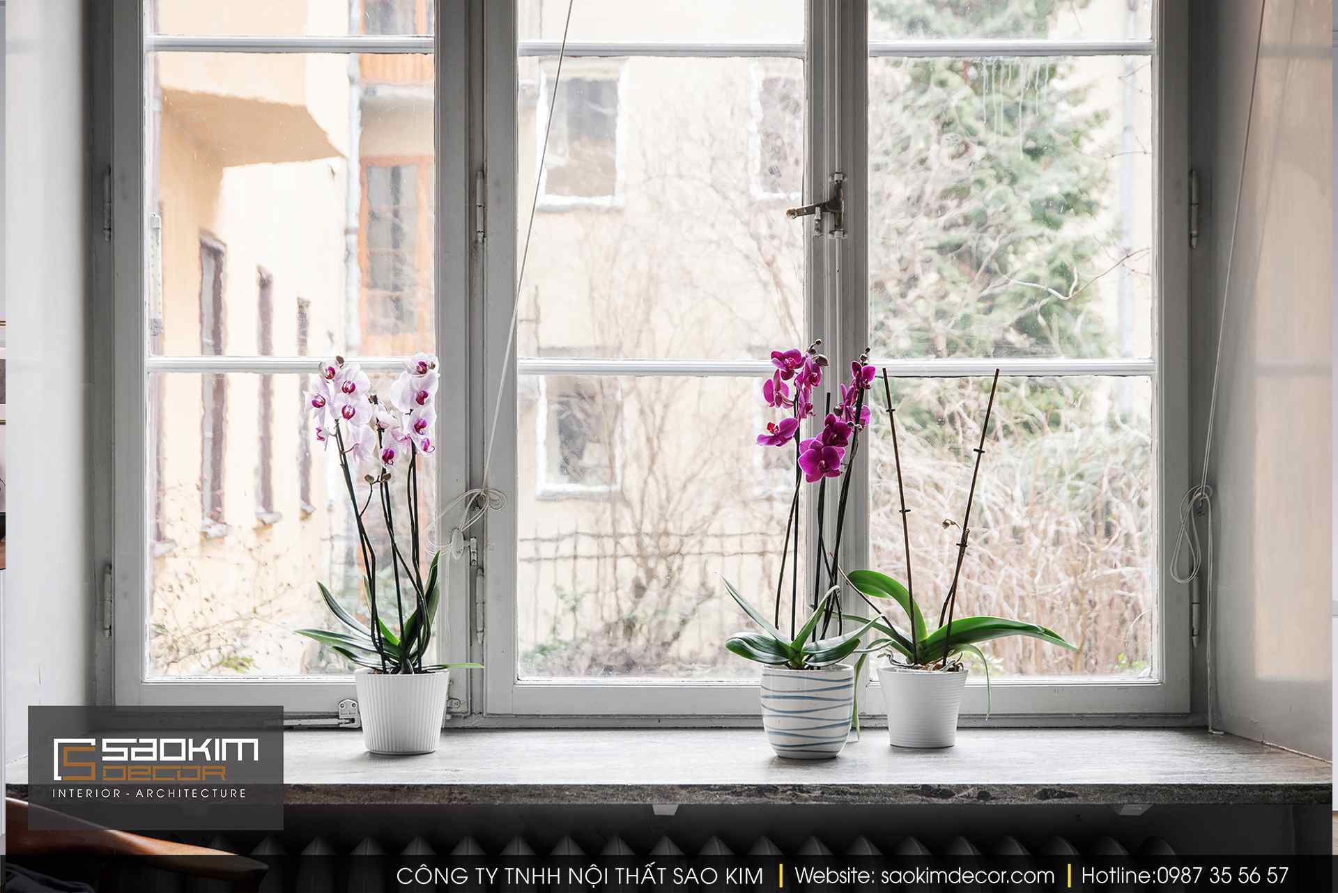 Những chậu hoa lan nhỏ với những bông hoa xinh xắn đang khoe sắc bên ô cửa sổ.