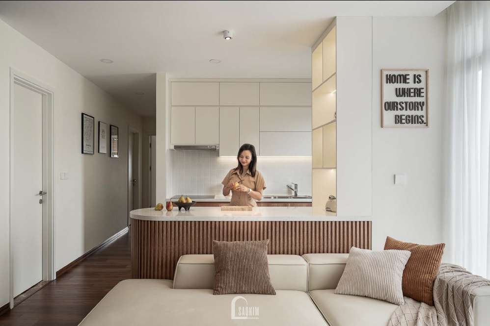 Đường nét thiết kế căn hộ chung cư đơn giản, mềm mại và các màu sắc trầm nhẹ, mang đến cảm giác ấm áp, gần gũi và thu hút khách đến chơi nhà.